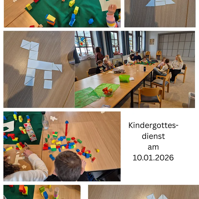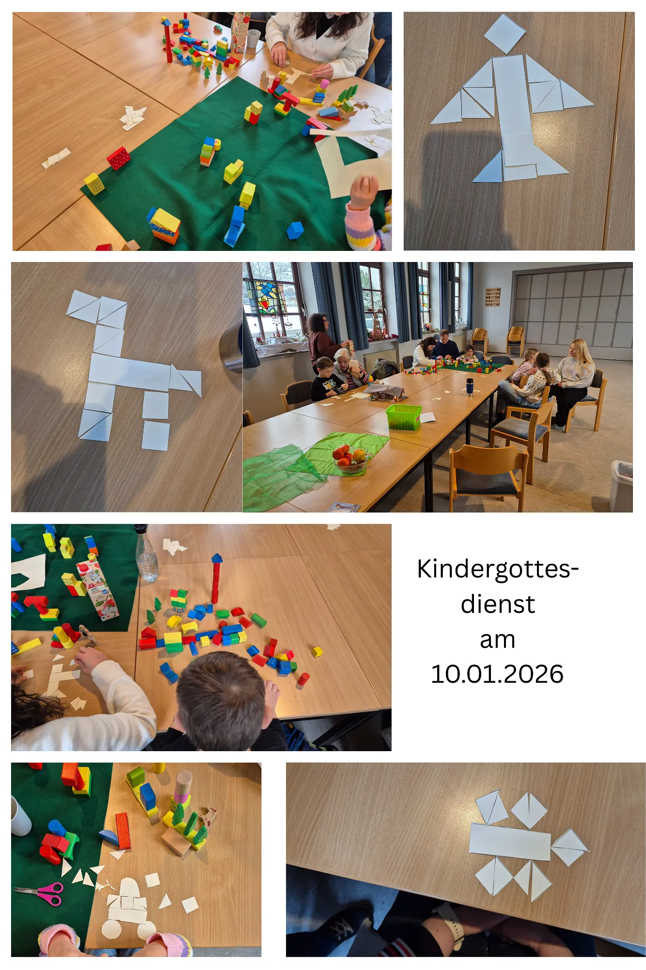 In diesem Kindergottesdienst ging es um die Jahreslosung 2026: "Gott spricht: Siehe, ich mache alles neu." Wir haben mit den Kindern eine Stadt aus Bausteinen neu aufgebaut und aus geometrischen Formen unterschiedliche Dinge gestaltet.