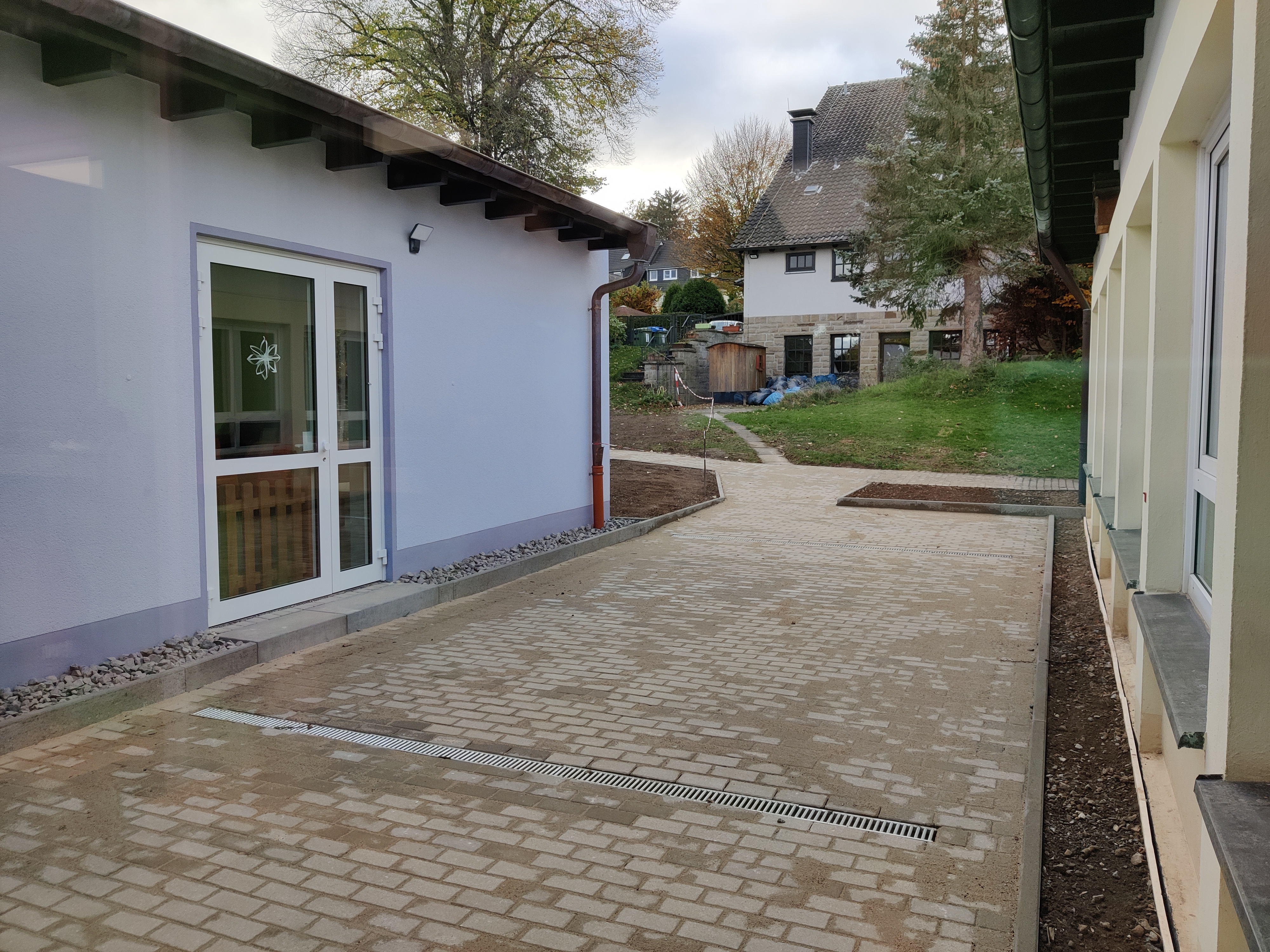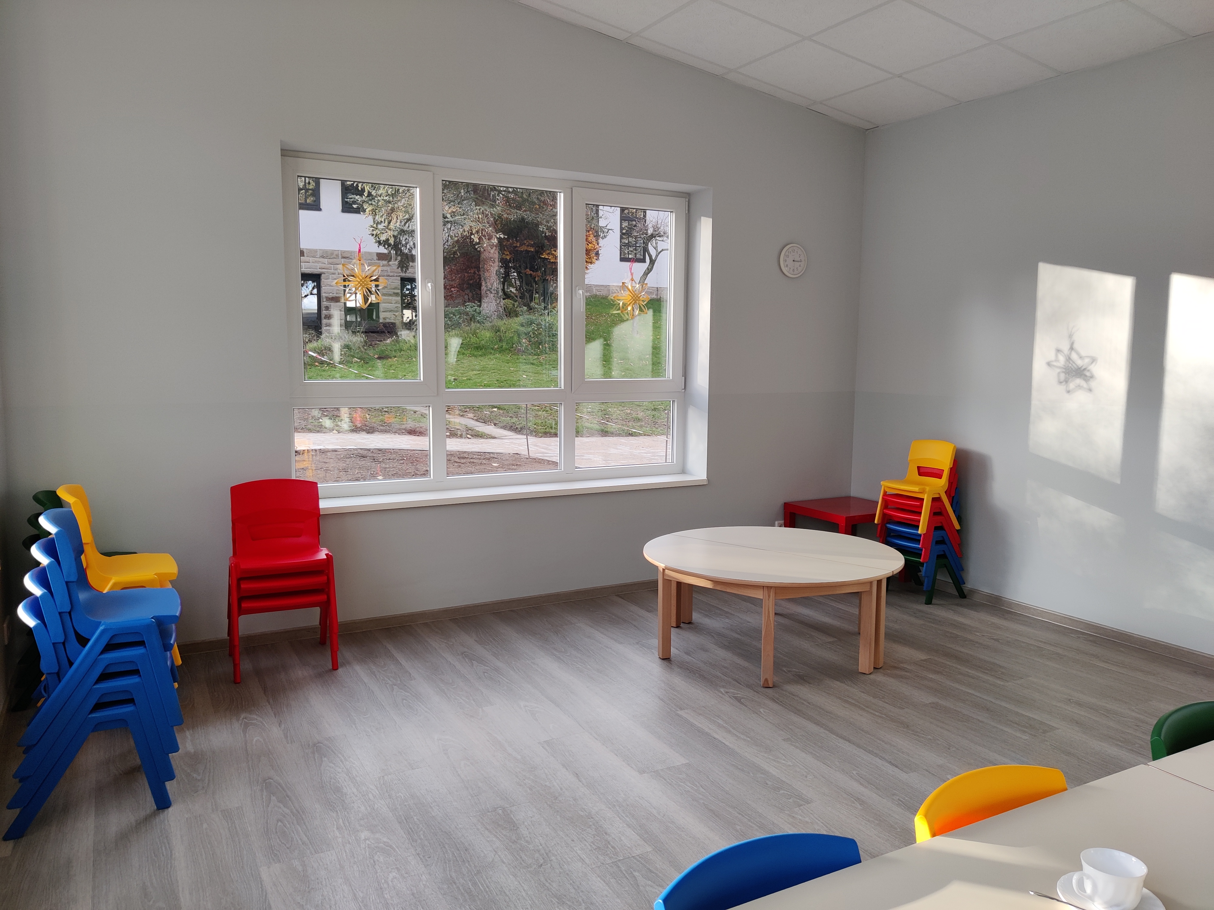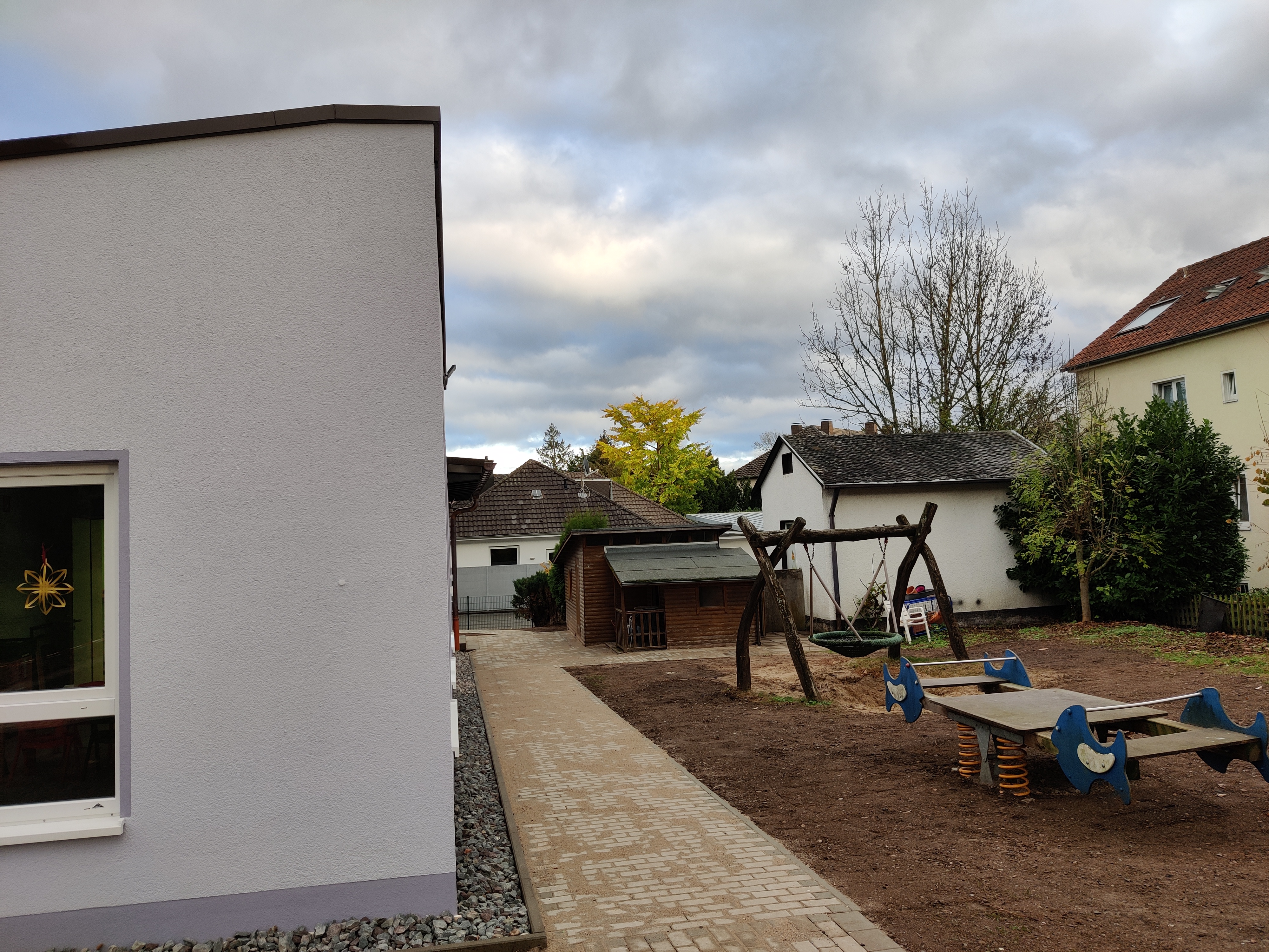 Die Kinder können nun in der neuen Küche gut mitarbeiten, da ein Teil der Arbeitsfläche auf die Kindergrößen angepasst wurde. Der Speieseraum wurde liebevoll mit bunten Kindermöbeln eingerichtet, so dass es richtig Spaß macht, dort zu essen. Und durch die vielen Fenster hat man einen wunderbaren Blick auf die Außenanlagen. Diese sind erst jetzt durch den Gartenbauer fertig gestellt worden, aber im nächsten Frühjahr wird wieder alles grün sein. Einige Bäume müssen noch wachsen, das Gewächshaus muss wieder bepflanzt werden. Aber es wird schon noch werden.